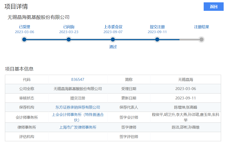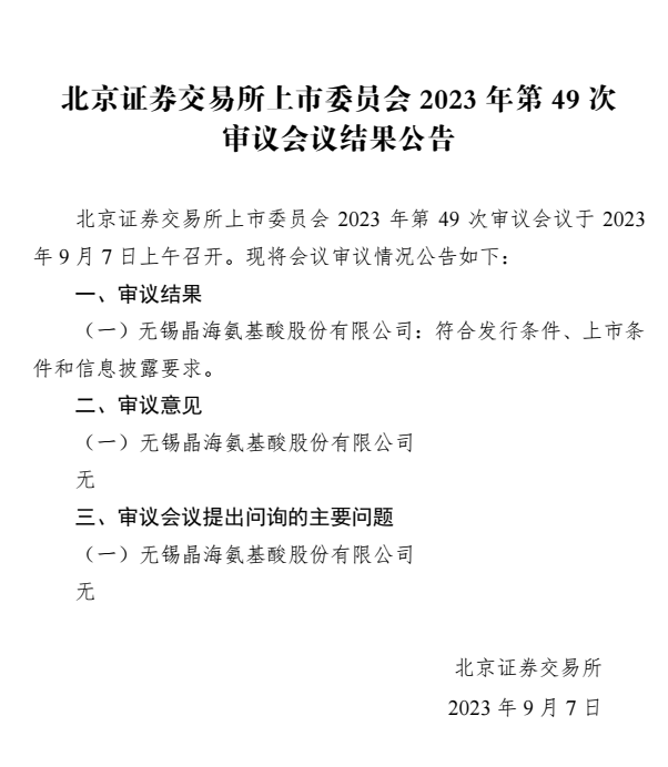 本所服务的客户无锡晶海氨基酸股份有限公司,在2023年9月7日通过北京证券交易所上市委员会2023 年第49次审议会议顺利过会!